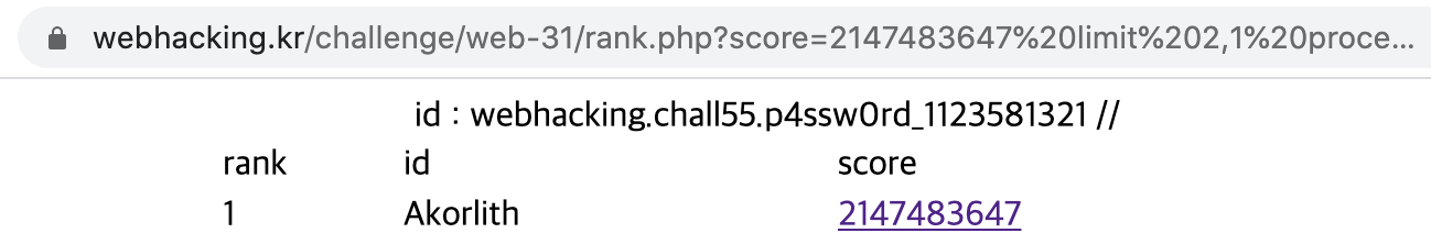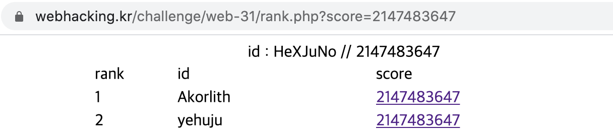 다른 유저들의 rank, id, score 가 출력되어 있고 아래 insert 문이 하나 있다. 스코어가 모두 2147483647 인 것을 보니 이 점수가 되면 flag 값을 주는 것 같다. 점수를 클릭할 수 있어서 클릭한 결과