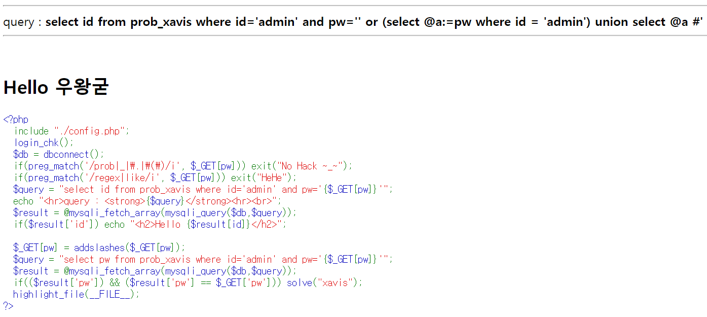 서브쿼리를 이용했고 쿼리의 의미는 a라는 변수를 만들어 admin의 패스워드 값을 대입하고 union을 이용하여