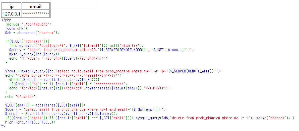 ?joinmail=1'), (0,'ip',(select email from prob_phantom where no=1)) %23 이 된다.