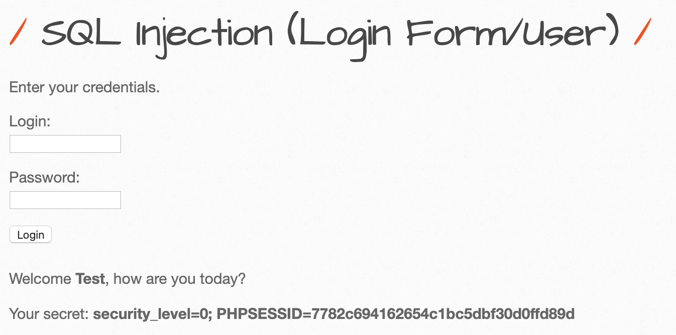 위와 같이 비밀번호를 변경한 뒤, 다시 SQL Injection (Login Form/User) 페이지로 가서 로그인을 시도해보았다.