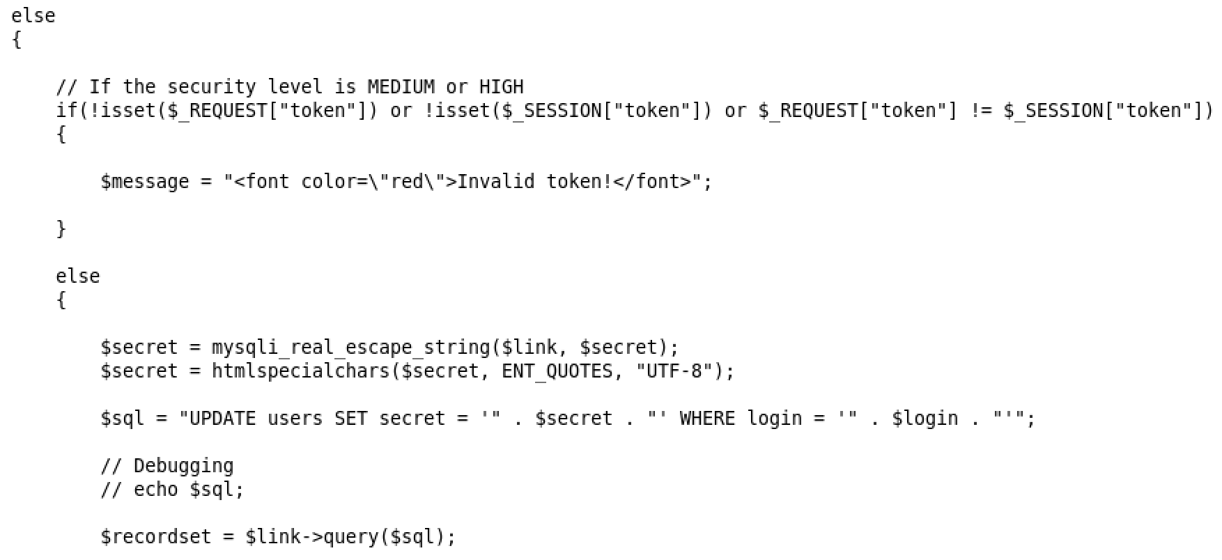 medium, high level 에서는 mysqli_real_escape_string() 함수와 htmlspecialchars() 함수를 통해 필터링하고 있다. 때문에 <> 이 필터링되어 일반적인 XSS 공격이 불가능하다.