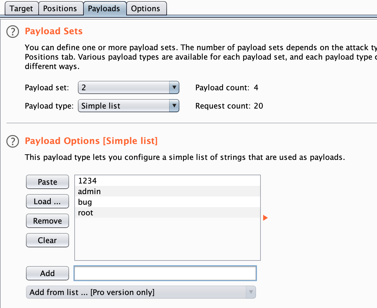 그리고 나서, Intruder 의 Positions 부분으로 이동하여 Clear 를 통해 기존의 설정을 지워주고 Position 부분에서 login 과 password 부분에만 페이로드를 선택해준다. Attack type 은 Cluster bomb 를 선택한다. Cluster bomb 는 Payload Position 만큼 Payload set을 설정한 뒤, 첫 번째 Payload set 을 반복 삽입하면서 동시에 두번째 Payload set을 차례대로 반복 삽입한다. 나중에 결과값을 보면 어떤 방식인지 확실히 알 수 있을 것이다.