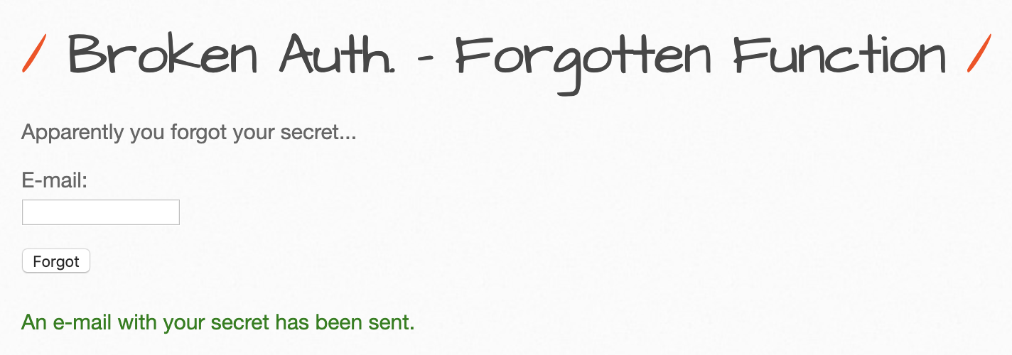 이메일을 입력하여 비밀번호를 찾는 페이지인 듯 하다. low level 같은 경우는 이메일만 입력해도 바로 비밀번호를 알려주고 있다. 요즘에 이런 페이지는 존재하지 않을 것이다.