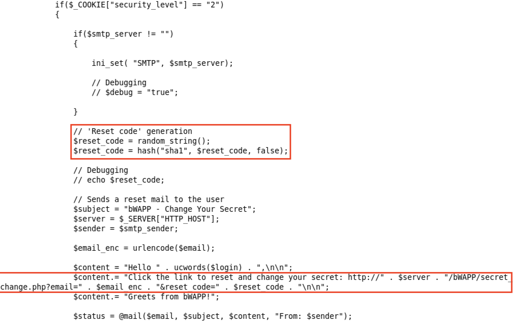 high level 에서는 랜덤 문자열을 SHA-1 으로 해시한 값을 reset_code 로 보내주고 있다. medium level 에서 기존의 비밀번호를 알려주는 방법보다 이처럼 reset_code 를 통해 강제로 초기화를 수행하게 하는 방법이 더 안전한 인증이라고 볼 수 있다.